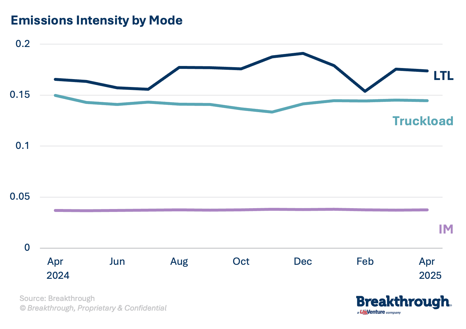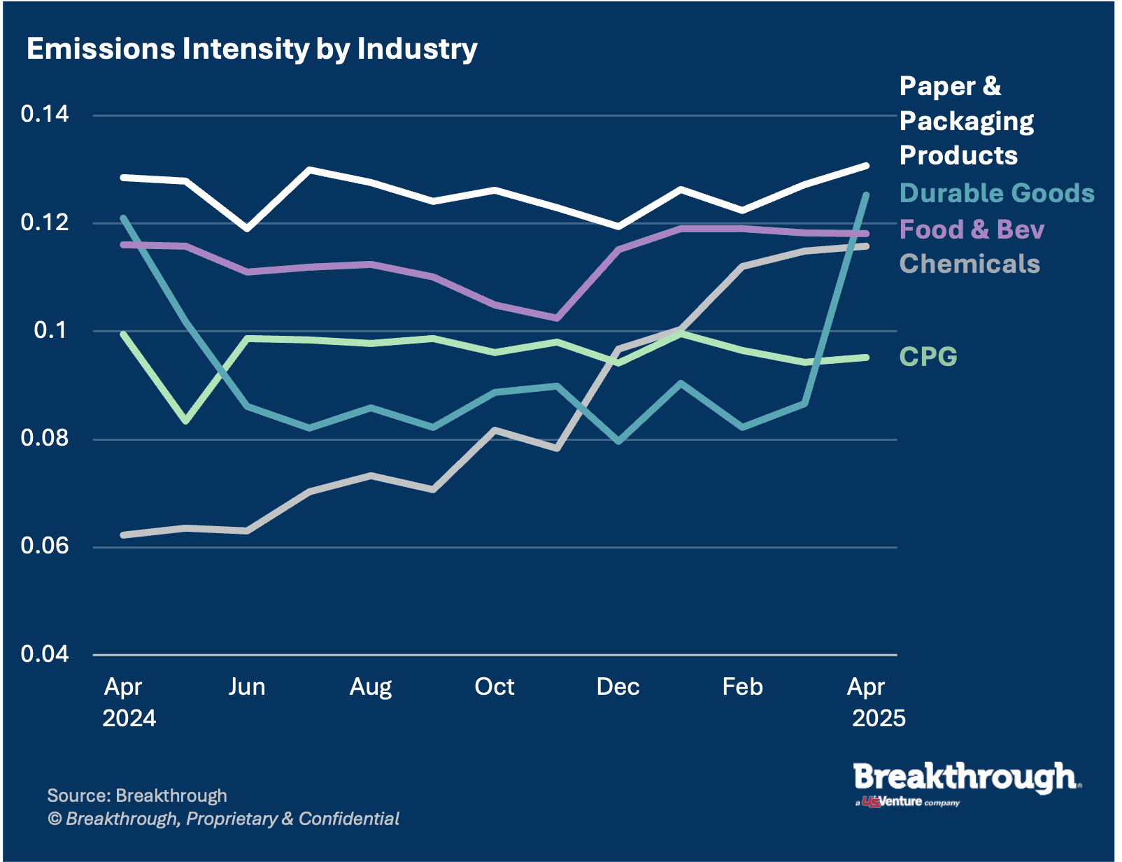 Los cargadores de Papel y Embalaje y Alimentación y Bebidas tienden a tener la mayor intensidad de emisiones, seguidos por los Bienes de Consumo Envasados y los Productos Químicos. En abril de 2025, los bienes duraderos registraron un repunte debido a las condiciones del mercado. La intensidad de las emisiones depende de varios factores, como el modo de transporte, la energía y el tipo de equipo, el peso de la carga y la eficiencia del transportista.