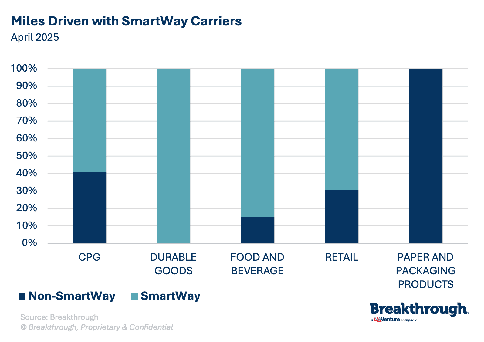 Los transportistas de bienes duraderos han adoptado ampliamente los transportistas SmartWay, mientras que los transportistas de papel y embalajes no muestran ninguna adopción. Se anima a los transportistas a unirse al programa SmartWay para obtener una puntuación precisa que refleje su comportamiento medioambiental, aumentando su atractivo para los cargadores que buscan socios de transporte eficientes y sostenibles. Del mismo modo, los cargadores deberían priorizar la colaboración con los transportistas SmartWay para apoyar a aquellos que invierten en flotas más limpias, contribuyendo al progreso hacia los objetivos de sostenibilidad basados en la ciencia.