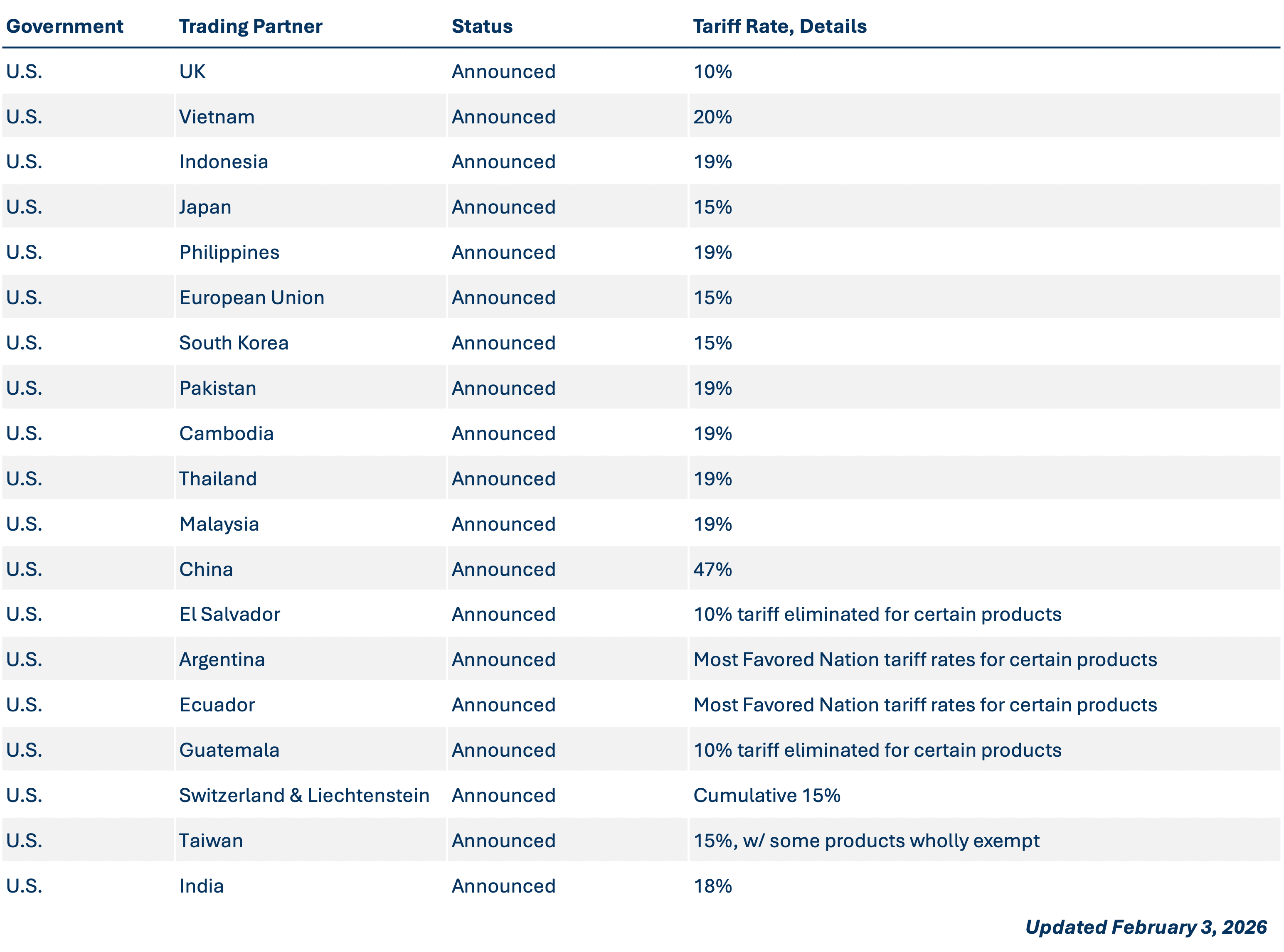 Announced trade frameworks and renegotiated tariff rates between the U.S. and trading partners.