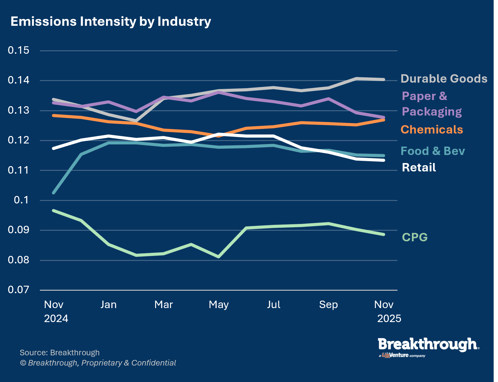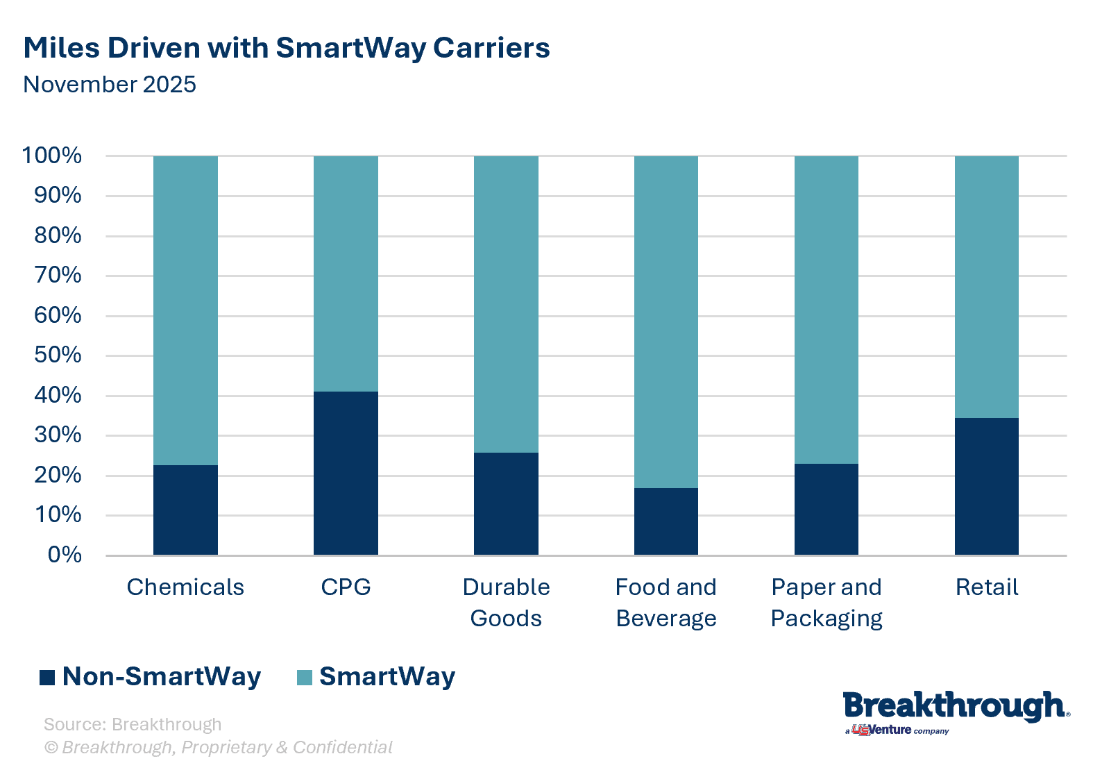 Best-in-class shippers are setting the standard on transportation emissions intensity and miles driven with SmartWay carriers by industry. Powered by dynamic, shipper-transacted data, Breakthrough's sustainability indices let you measure your network’s performance—guiding smarter decisions for a sustainable future.