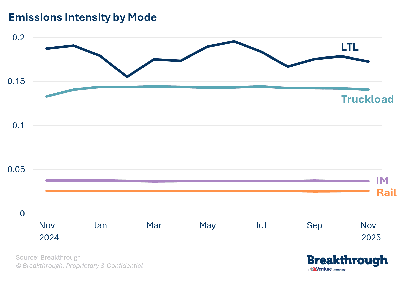 Emissions intensity measures the volume of lifecycle emissions produced against a measure of business output, in this case, measuring emissions produced by moving one ton of goods one mile. This data provides valuable insights into the progress and effectiveness of sustainability initiatives by mode.